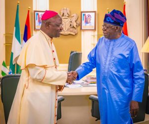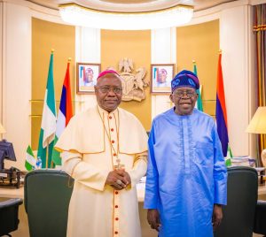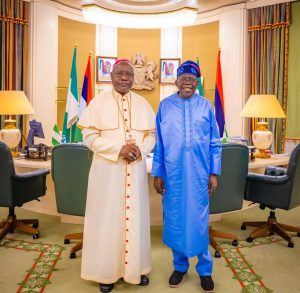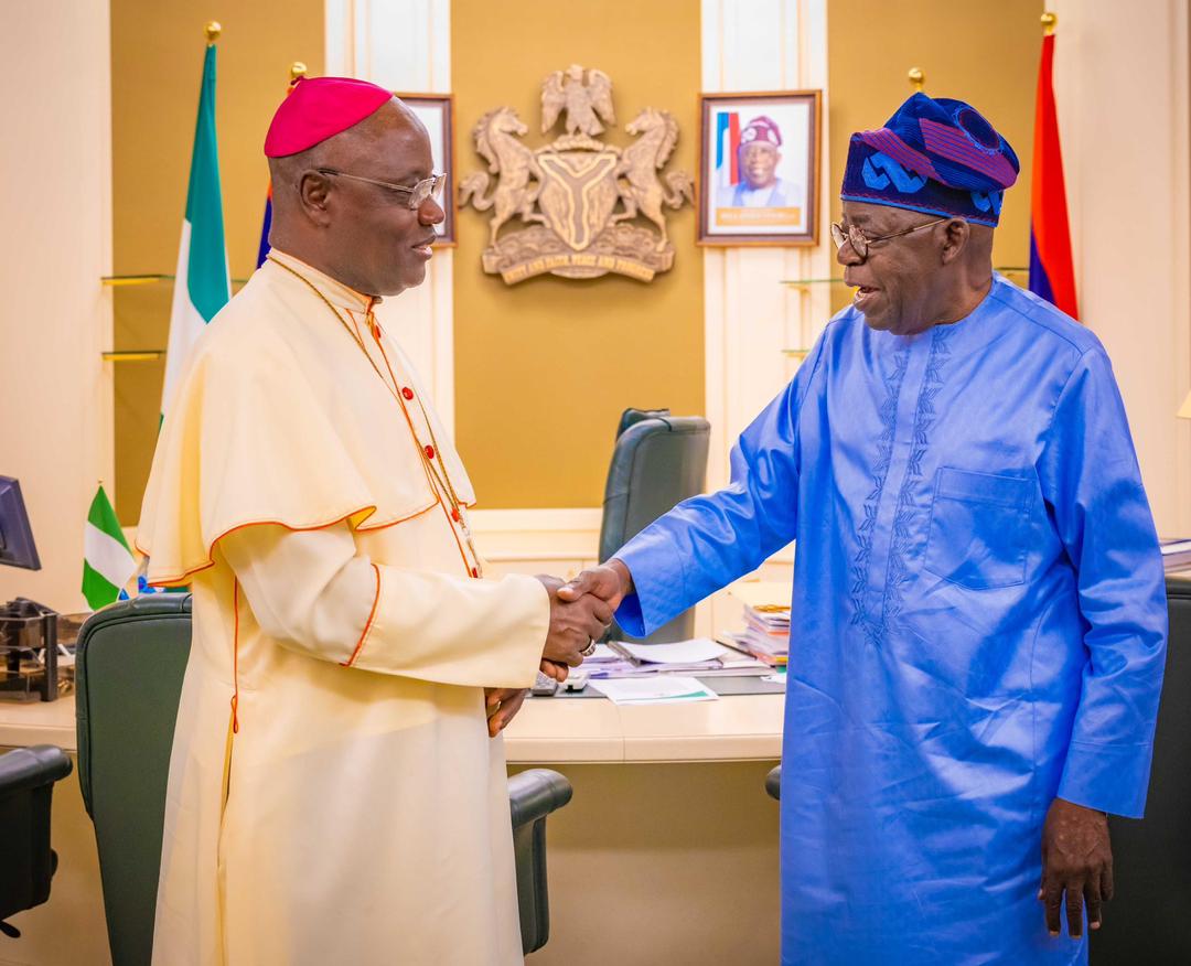 President Bola Tinubu receives in audience His Grace Most Rev. Dr Ignatius Ayau Kaigama, the Archbishop of Abuja Catholic Diocese, in the State House, Abuja, 4 November 2025